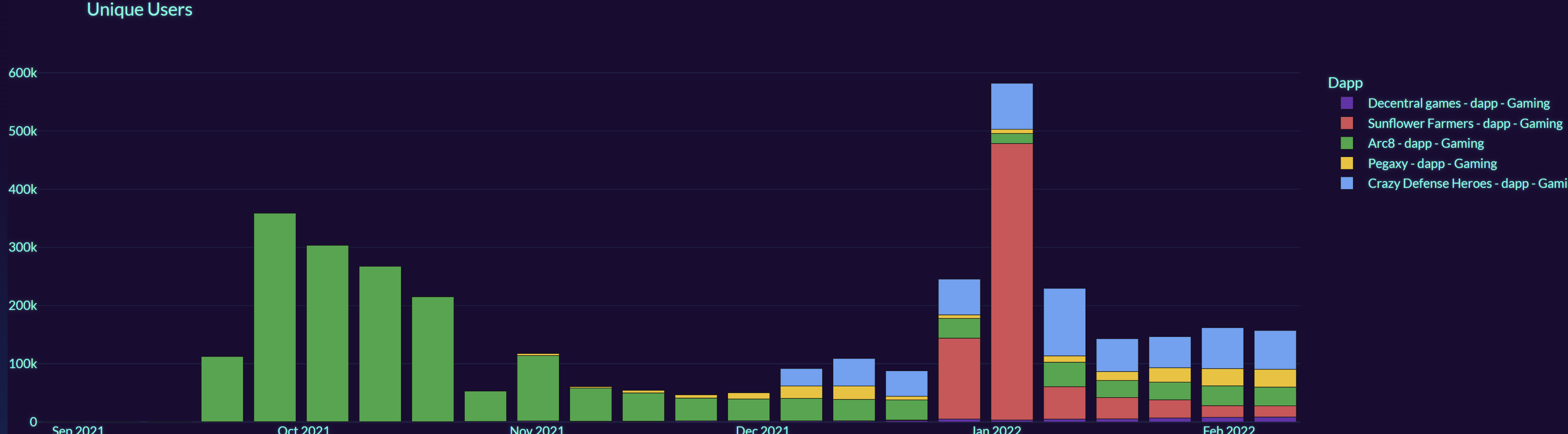 - Polygon’s user base continues to expand and display increasing engagement, with 2.36m unique addresses last month. Daily unique addresses have increased over the past 3 weeks, and are now back to 346k after dipping from Sunflower Farms’ peak insanity. Last week’s top dApps by users include QuickSwap (77.1k), Crazy Defense Heroes (66.5k), Arc8 (32.2k), Pegaxy (30.6k), Sunflower Farmers (19.2k), SushiSwap (18.8k), and Uniswap (16.6k).