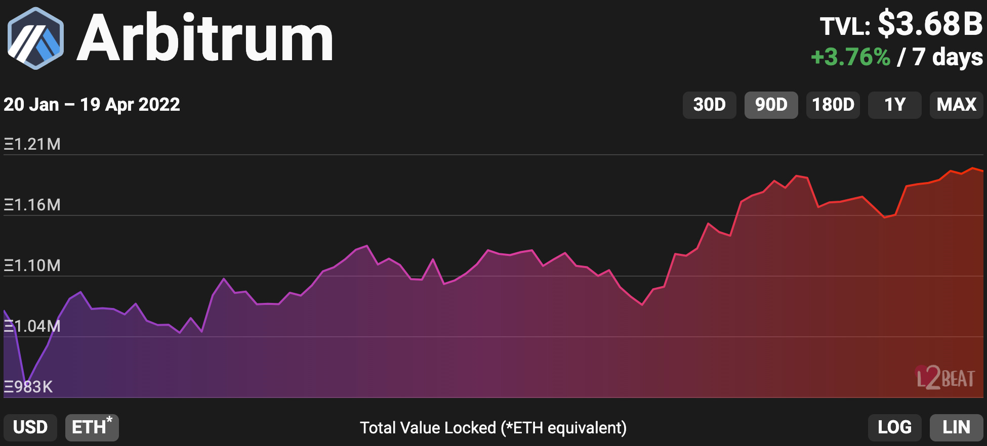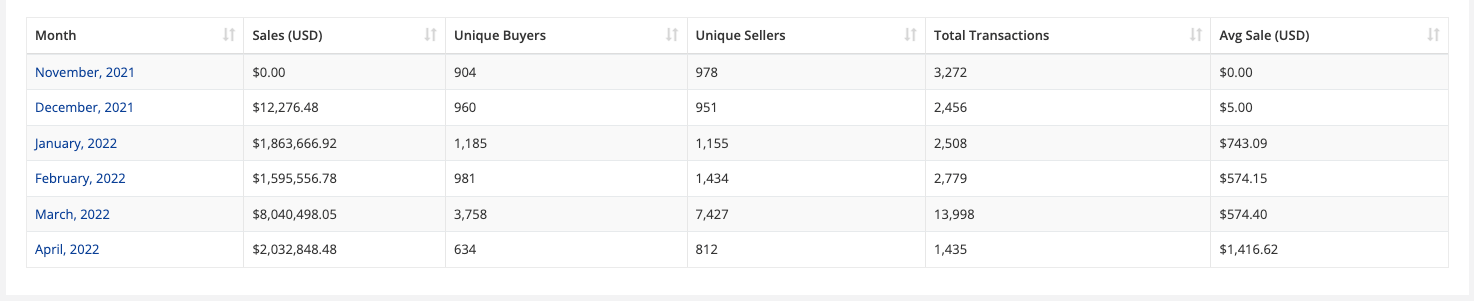 - NFT projects continue to see growth on Arbitrum on average, with already over $2m traded halfway through April. Average sales price of each NFT on Arbitrum also continues to rise up from ~$574 to ~$1,416 month over month. Major contributors to this growth include Treasure and Dopex ecosystem NFTs.