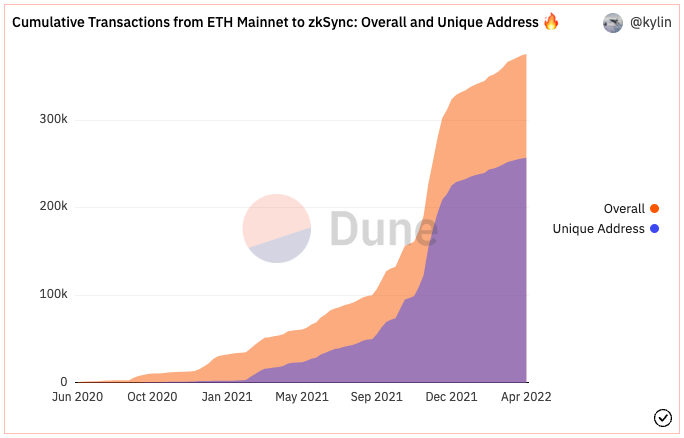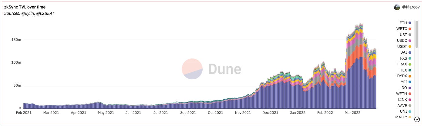 - At time of writing, zkSync 1.0 currently has ~$132.4m TVL. TVL reached an all-time high in March 2022 of $163m. The mainnet release of zkSync 2.0 could usher in the next wave of innovation unlocked by the combination of ZKPs with EVM compatibility and composability.