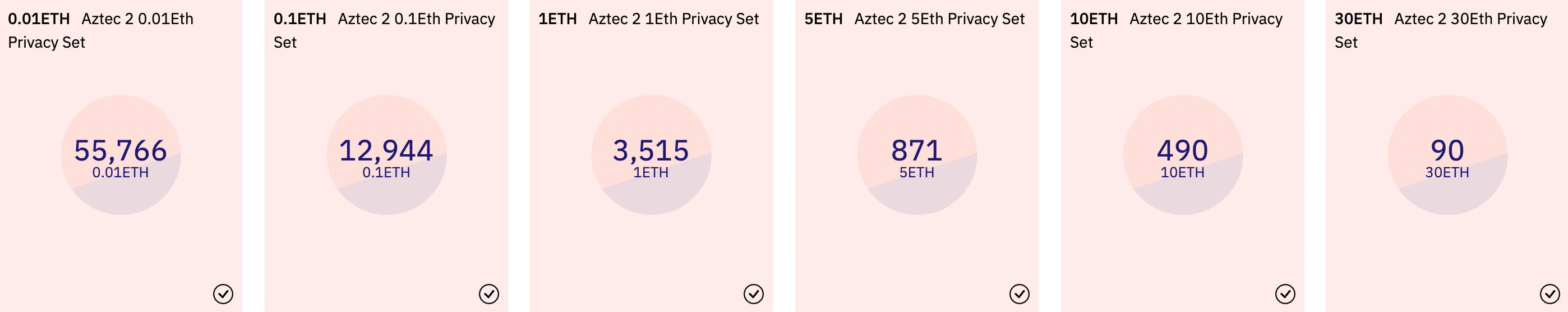 - Aztec's privacy-first zkRollup has also amassed a significant anonymity set, with the 0.1 ETH deposit set ~60% of the size of Tornado Cash's for the same deposit amount. The complexity of private internal transfers and private DeFi inherently make de-anonymization of transactions much harder.