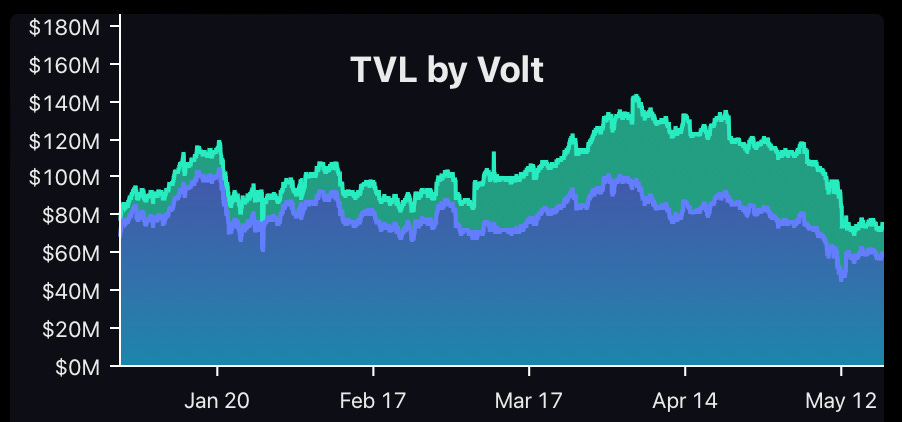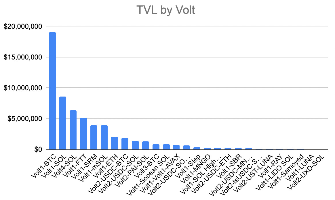 - The most popular Volts are the covered call Volts for BTC, SOL, FTT, and SRM as well as the delta-hedged basis strategy in SOL. These top 5 Volts currently account for $43 million of TVL. The remaining 22 Volts, some of which are recent additions, range in TVL from ~$50K to $4M in TVL.