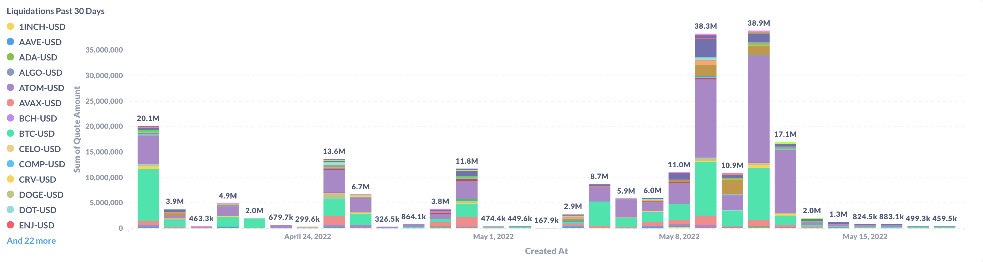- On May 9 and May 11, users on dYdX experienced much greater levels of liquidations than average. Over $105m in liquidations occurred between May 9 and May 12.