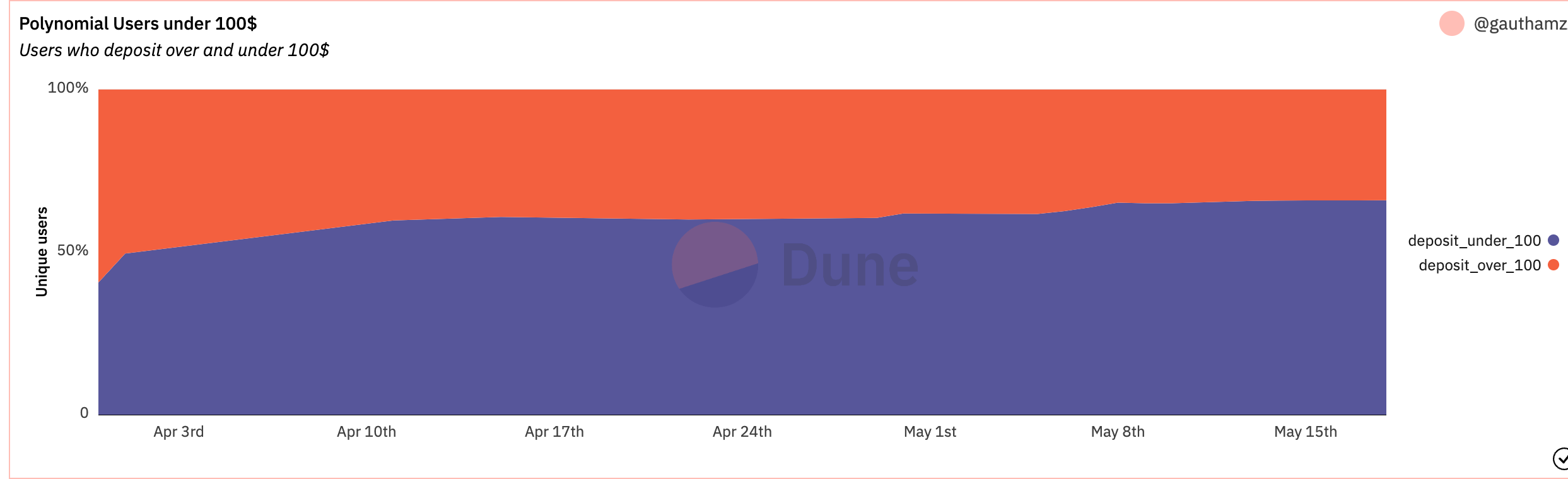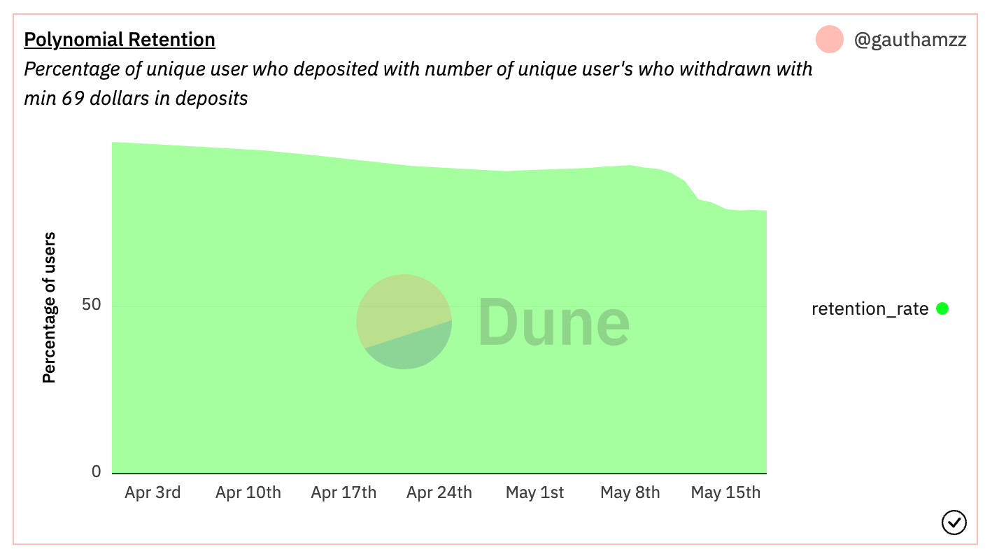 - Since launch, 78% of the users who have deposited in the Polynomial Earn Vaults haven't withdrawn from the Vaults. With a 140% increase in users from the past month, vaults consistently drive user volume and show strong retention.