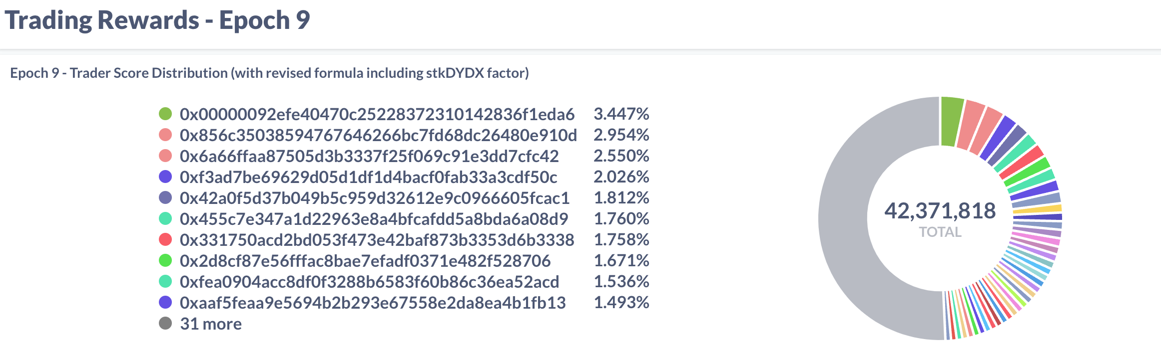 - Trading rewards for Epoch 9 were distributed across 6,546 unique addresses. The distribution of Trading Rewards remain pretty evenly distributed across a long tail of addresses. Overall participation in the dYdX liquidity mining programs remains relatively constant across all epochs.