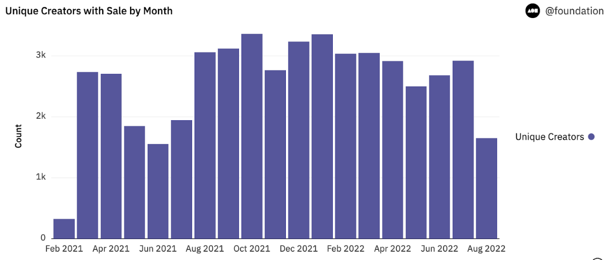 - Foundation continues to be a strong home for creators despite the market downturn, with nearly 3k unique creators selling NFTs on the platform every month. Top-earning creators like Shizuka Aizawa (anime), Mcbess (animation), and OSF (glitch) have all had >25 ETH in sales over the last 30 days.