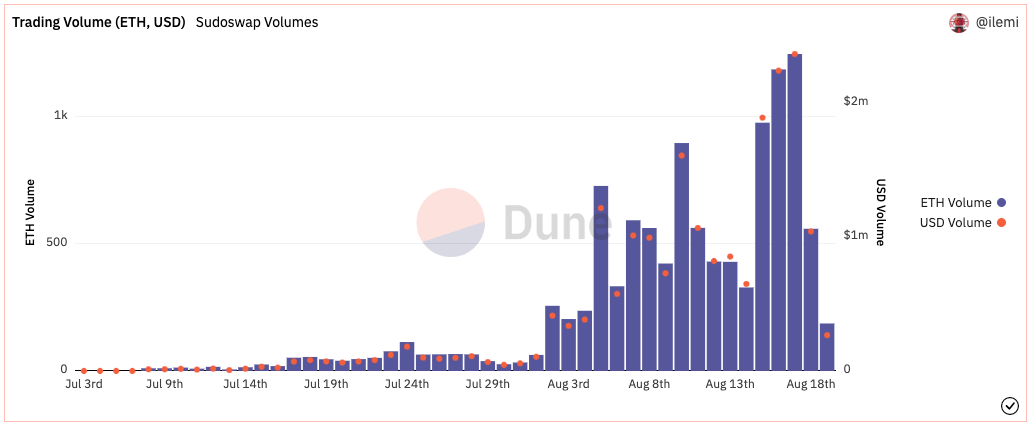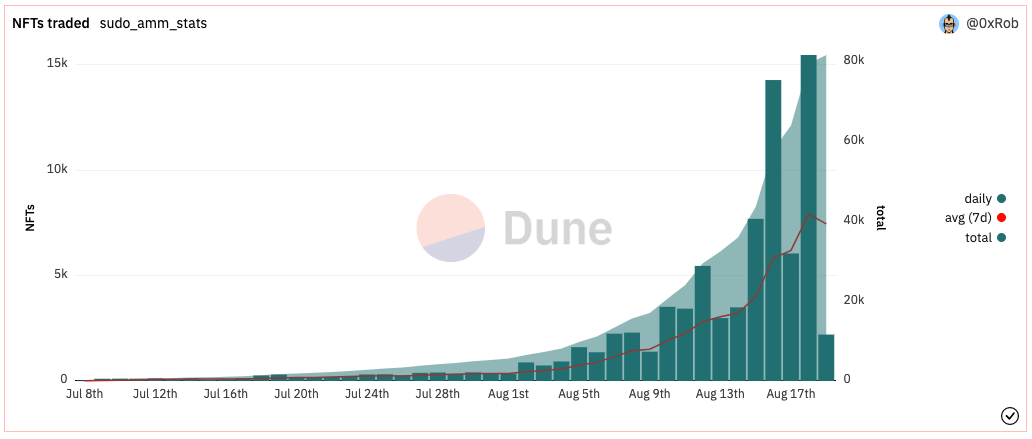 - Over 10k NFTs trade daily on Sudoswap across 14k liquidity pools. This has generated >50 ETH of fees for the protocol and >300 ETH for trade pool owners, representing a potentially more sustainable business model for creators to replace royalty streams, with improved trading market efficiencies.