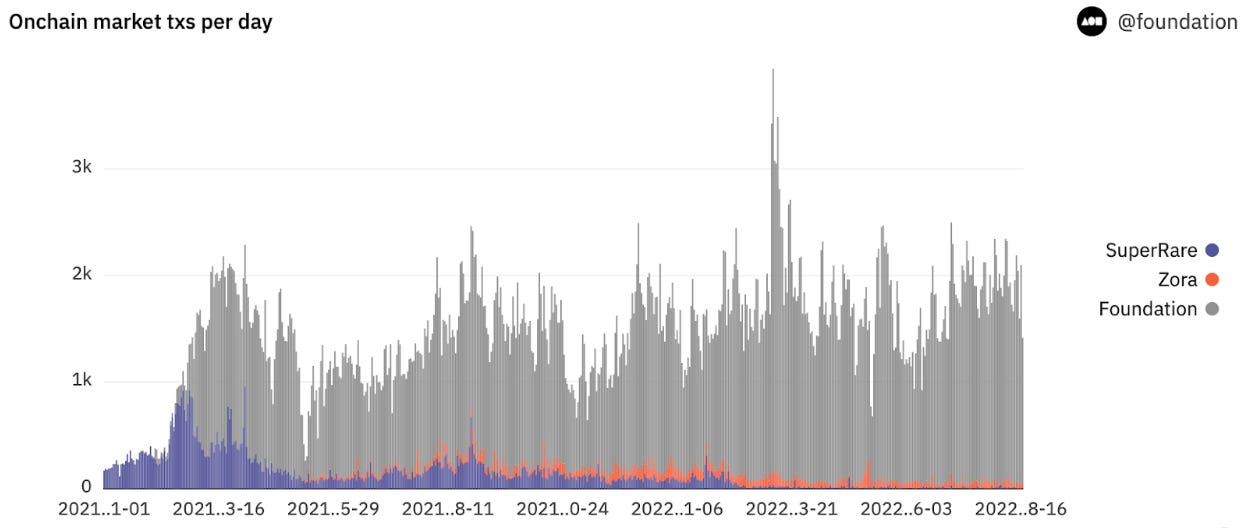 - Foundation’s protocol continues to facilitate the most on-chain transactions of any marketplace, representing over 90% of on-chain activity. This speaks to the platform's commitment to giving creators the greatest amount of ownership of their work by creating an entirely on-chain ecosystem.
