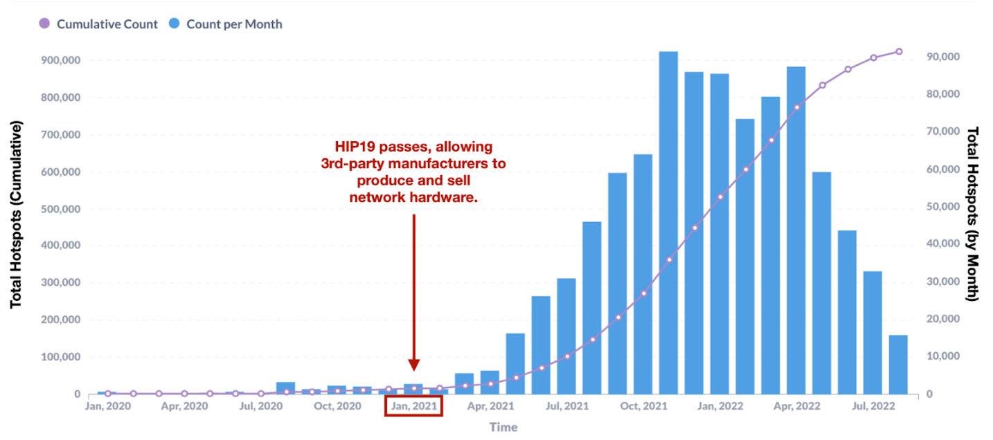 - To date, two critical Helium Improvement Proposals (HIP) have been enacted: the first, HIP19 (approved in Jan 2021), allows 3rd-party manufacturers to produce and sell network hardware. Since HIP19 was enacted, the number of hotspots deployed has grown ~63x (CAGR of ~1,200%).