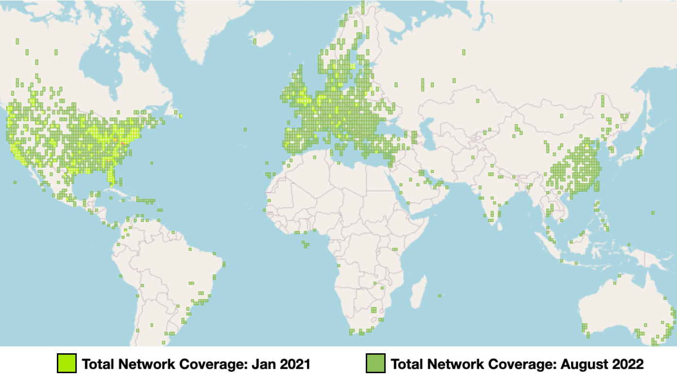 - The Helium Blockchain incentivizes the creation of public, decentralized wireless networks. Since their 2019 launch, Helium has become the largest IoT network in the U.S. (and the fastest growing IoT network worldwide). To date, nearly 930k hotspots are live with coverage in 182 countries. Notably, the rate of new hotspots joining the network peaked in November 2021, and has fallen consistently since April 2022.