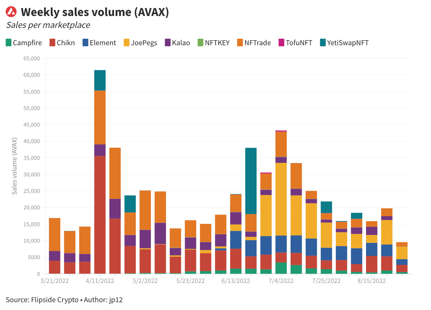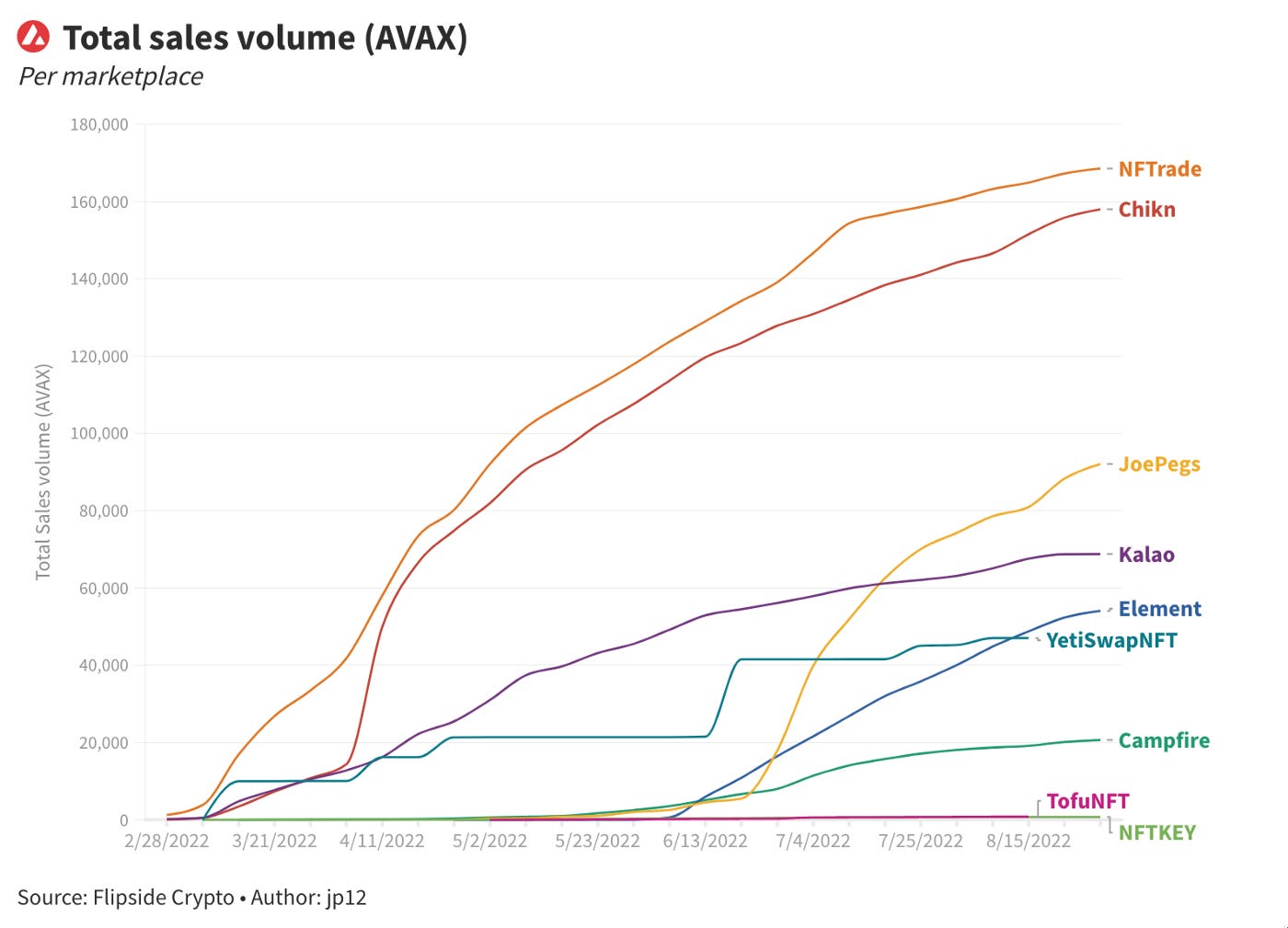 - NFTrade and Chikn marketplaces have driven the most volume since March 2022, with both exceeding 150k AVAX volume. JoePegs which is built by Avalanche’s top DEX - Trader Joe - has quickly risen to #3 rank after its launch in May. Trader Joe has a very strong brand, so this emergence is expected.
