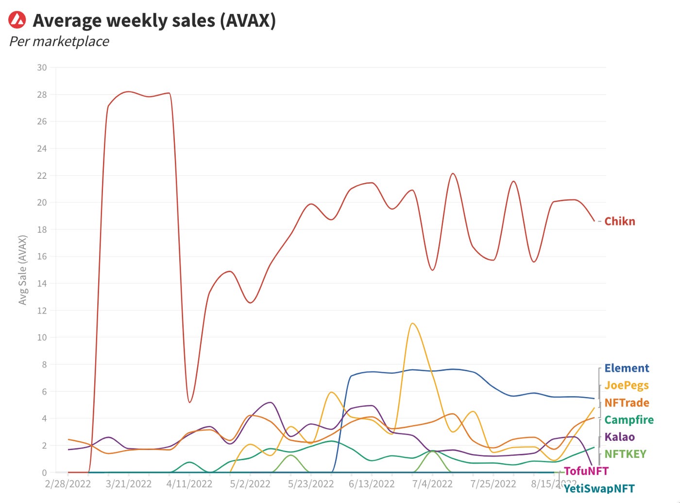 - Observing the weekly averages, we find the “Chikn” marketplace is tracking above the rest. Chikn is doing around 18–22 AVAX per sale, while every other marketplace is averaging at least 2–3x less. This is not an anomaly as the floor price for a “common” NFT is 35 AVAX.