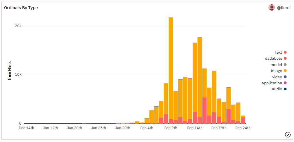 - While initial momentum of minting (inscribing) has slowed from the 20k a day peak, there are still 5k mints a day. Image and text content are leading the way, making up 99% of mints. To find out more about how Bitcoin NFTs, Ordinals, and Inscriptions are related, check out this guide that explains the query behind the chart.