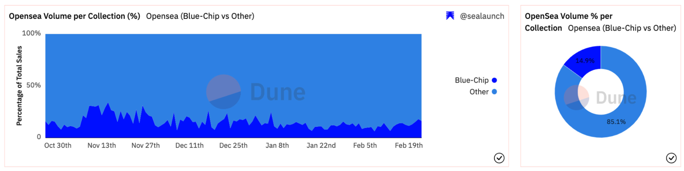 - In comparison, ~41% of Blur’s volume originated in these same collections. OpenSea volume originates from a higher number of collections as well as from a higher number of users (while in Blur there is a bigger concentration in collections/users that have an impact on volume), suggesting OpenSea still has a deeper supply-side of collections.