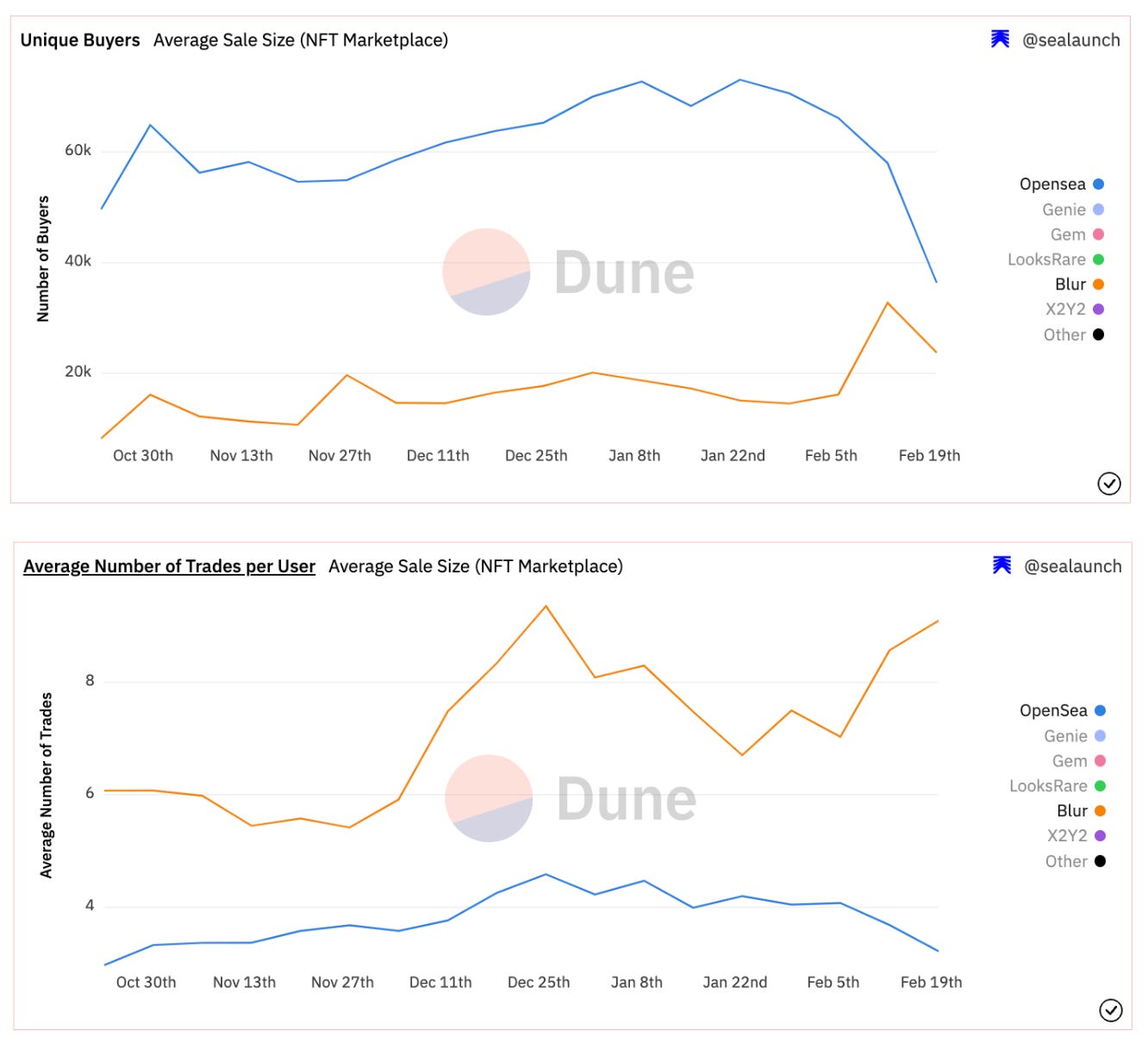 - In the last 60 days, OpenSea lost some unique buyers to Blur and the average number of trades per user declined slightly. In other words, a group of NFT traders began shifting from using OpenSea to using Blur, and current users are trading more on average on Blur than on OpenSea as was the case before. This is likely influenced by Blur airdrop strategy (and its season 2 trading incentives).
