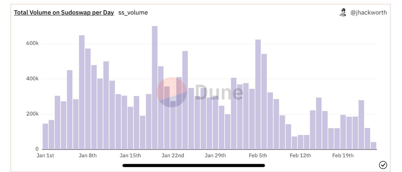 - Since the beginning of the year, Sudoswap has generated close to $16m in total volume and $426k in pool fees. However, there has been a drop in volume since February, compared to a peak of $700k in volume on January 19th. Currently, the platform holds only about 1% of the total NFT volume across all marketplaces due to Blur's airdrop explosion.