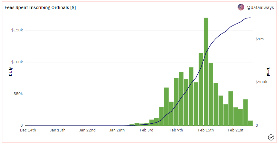 - Inscriptions have generated $1.25m in fee revenue for Bitcoin so far. It has also increased taproot adoption (a new transaction/address type) up to 10% at its peak. Most future Bitcoin applications will be built off of taproot, so pushing its adoption is as important as the promotion of segwit.