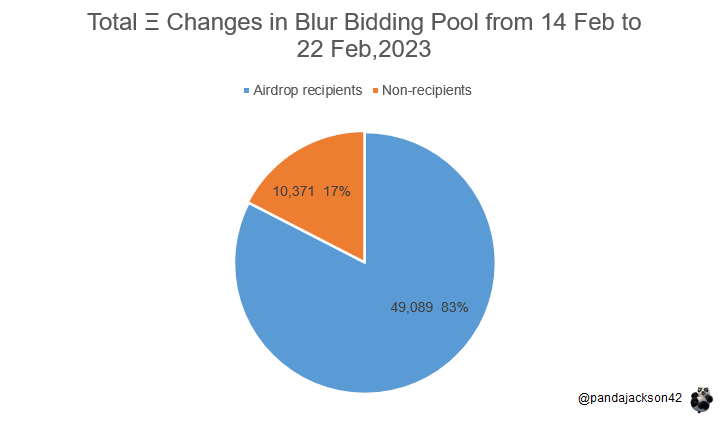 - TVL of Blur's Bidding Pool has increased to 77k ETH (130m USD) as of February 23rd, representing a 3.2x increase from the pre-token launch size. The pool's deposits have grown along with the platform's trading volume. 80% of the inflow were made by airdrop recipients, indicating the positive impact of the Blur token launch and second season airdrop incentive on the marketplace's growth.