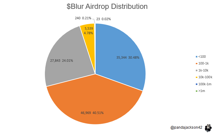 - Examining the airdrop distribution, 35k recipients received less than 100 Blur tokens while 5.5k users received more than 10,000 tokens. The median amount of airdrop tokens is less than 300, which is only 1/10 of the average.