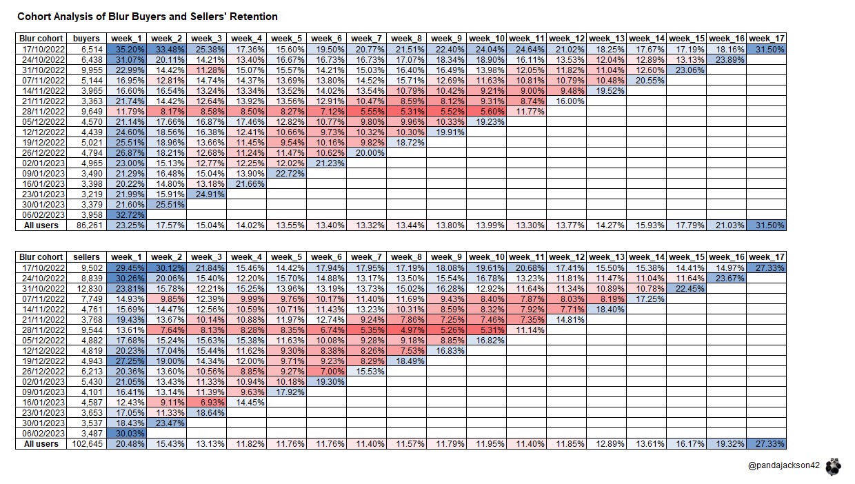 - After a decline in retention rate to below 10%, Blur saw a rebound after their token launch. The first week retention was 35% and gradually decreased. However, the launch led to a rebound with a retention rate of 20-30% for all user groups.