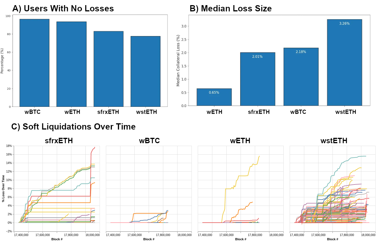- In August, volatility produced widespread liquidations in crypto markets. Long term stats show crvUSD borrowers were largely insulated from liquidation. (a) Across crvUSD markets, ~85% of users had 0 loss, (b) Median losses were ~2% for losing positions, (c) Soft liquidations were limited to <18%.