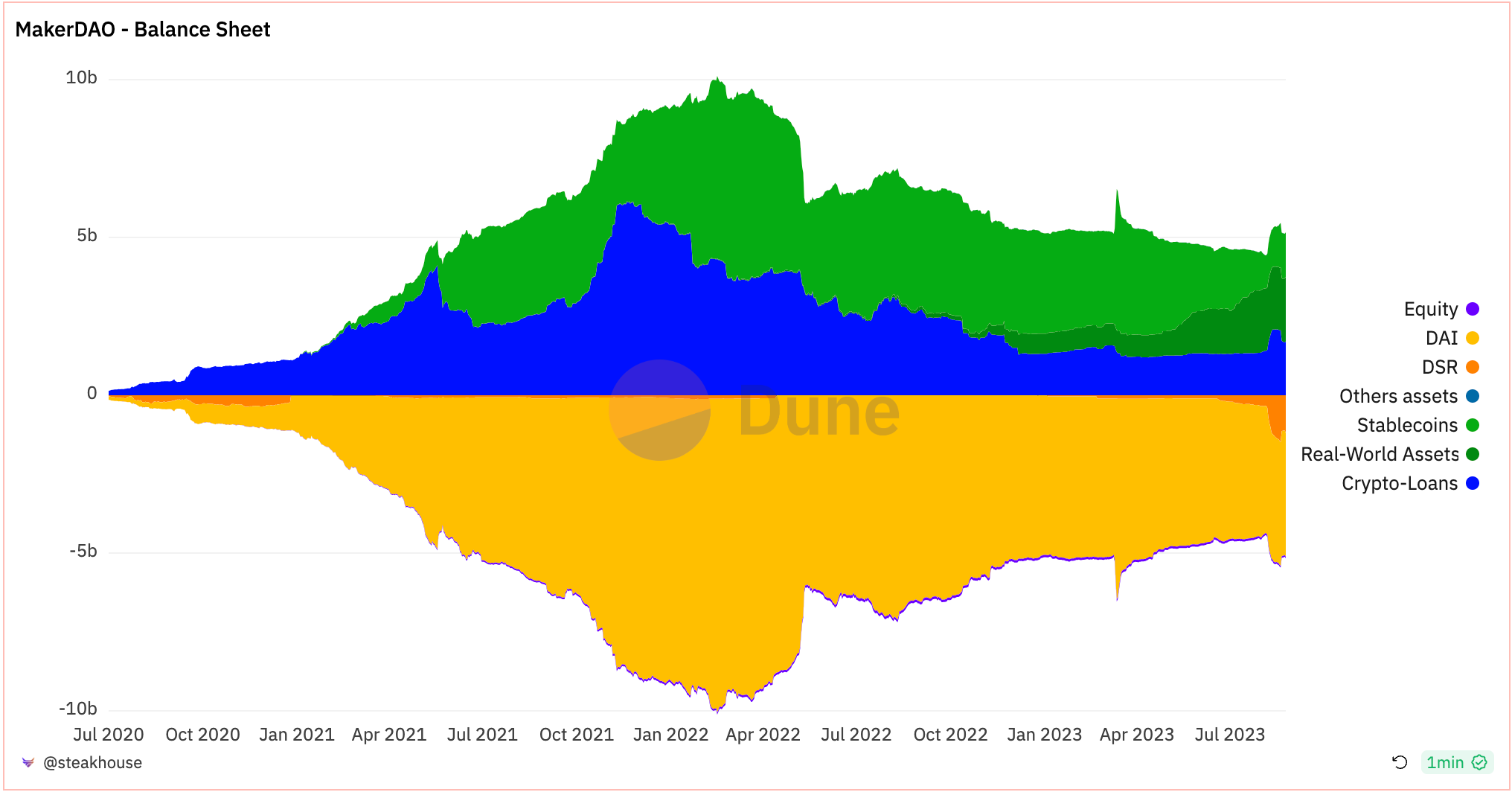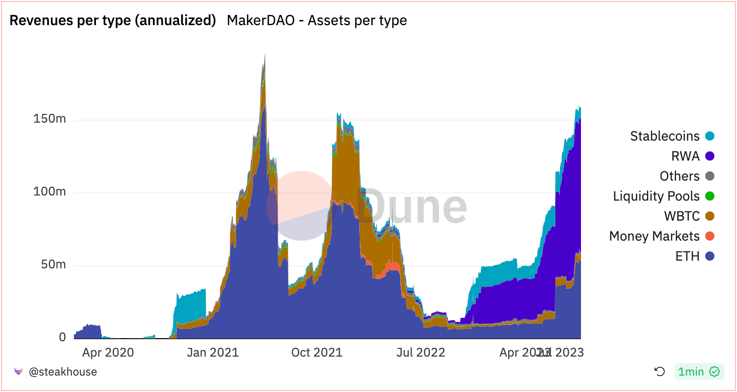 - MakerDAO experienced a big trend in the shift of stablecoin holdings to Real-World Assets (mainly T-bills) through projects called Clydesdale and Andromeda. As of August 24, 2023, Maker’s expected annualized revenues is $158.5M, of which $90M is from real-world assets.