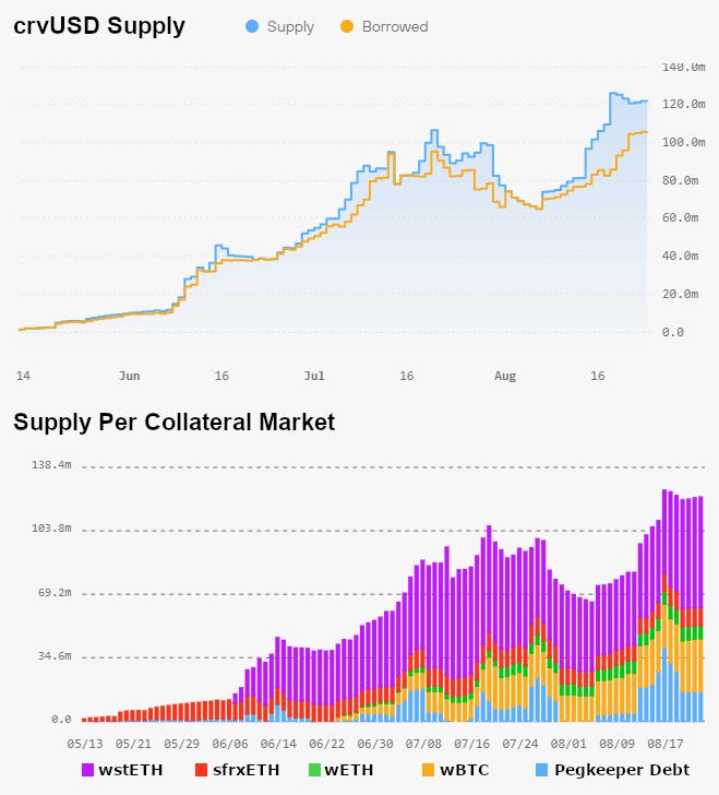 - Despite significant market volatility, crvUSD has continued to grow through August, with total supply reaching a new all-time high of 122 million. The wstETH market continues to dominate with a total size of $60M (debt cap: $150M), followed by wBTC ($28.7M; $200M cap), sfrxETH ($9.9M; $10M cap), and wETH ($7.2M; $200M cap). Across crvUSD markets, the total debt cap is 560M, allowing for future expansion of crvUSD's total supply.