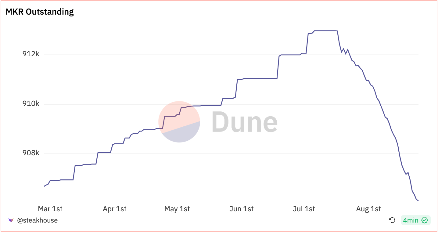 - The influx of revenues made it possible to enable the Smart Burn Engine in mid-July, which uses Maker’s surplus buffer to purchase MKR from a Uniswap pool, thereby removing MKR from circulation. This update made MKR deflationary. MKR’s outstanding supply decreased from 912k MKR in mid-July to 906k today.