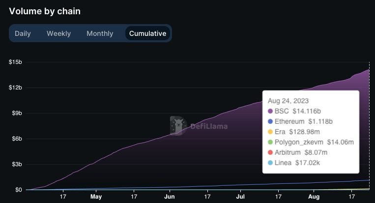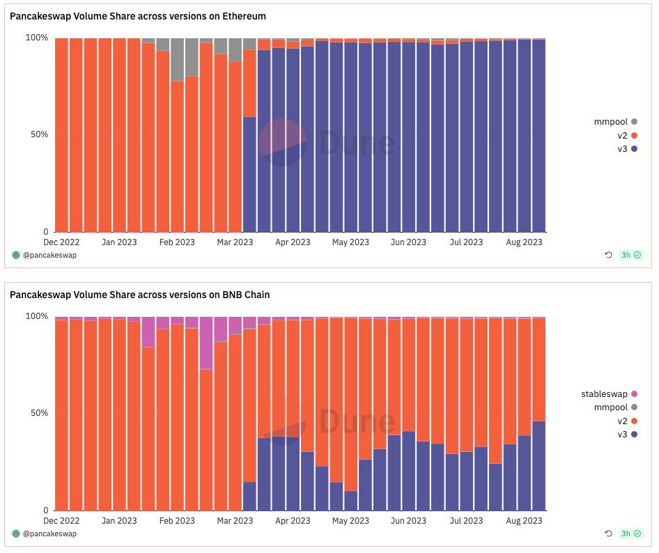 - Zooming in on differences between v2 and v3: As of the end of March, v2 had 88% and 91% share in PancakeSwap's total volume on Ethereum and BNB Chain, respectively. The dominance of v2 has shifted with the introduction of v3, as v3 now takes up to 99% of the volume on Ethereum and 46% on BNB Chain.