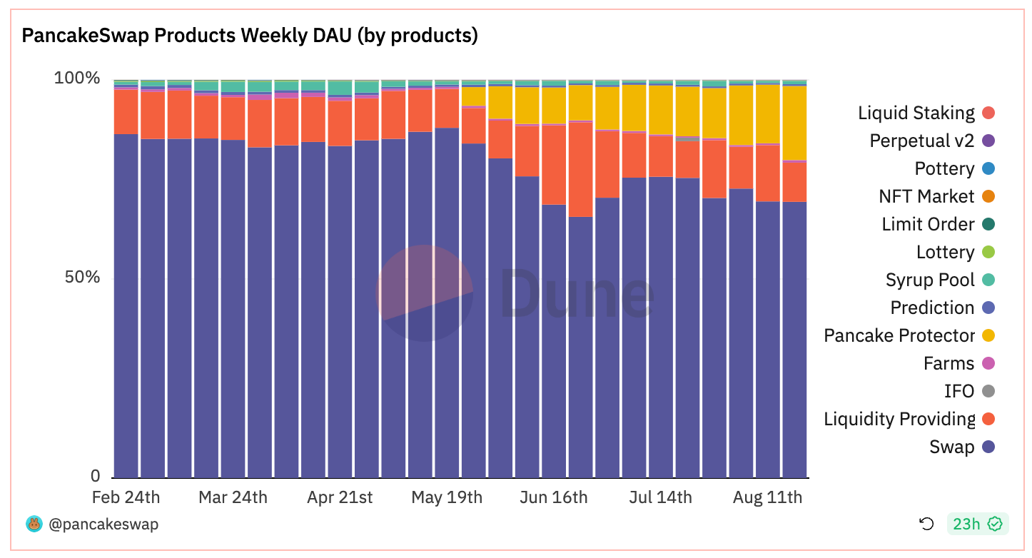 - Looking at different products, we see that before the end of May, Swap had accounted for 88% of the total Daily Active Users (DAUs) on the platform with 150k+ daily users. Since Pancake Protectors launched, the game has become the second largest DAU contributor with around 25K+ daily users, accounting for about 15% of the total DAUs of PancakeSwap in recent weeks with Swap's DAU share falling to 70%.