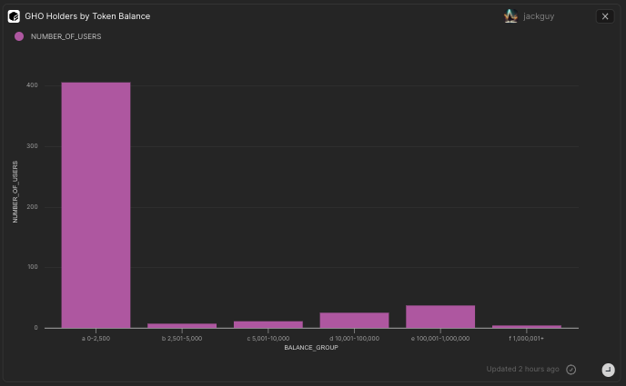 - Among 493 GHO token holders, 414 possess less than 2.5k tokens, while 41 command over 100k. The average holder's stake is 48.6k GHO, but the median sits at 45.1 GHO. This breakdown reveals a diverse distribution pattern in the GHO small community of holders.