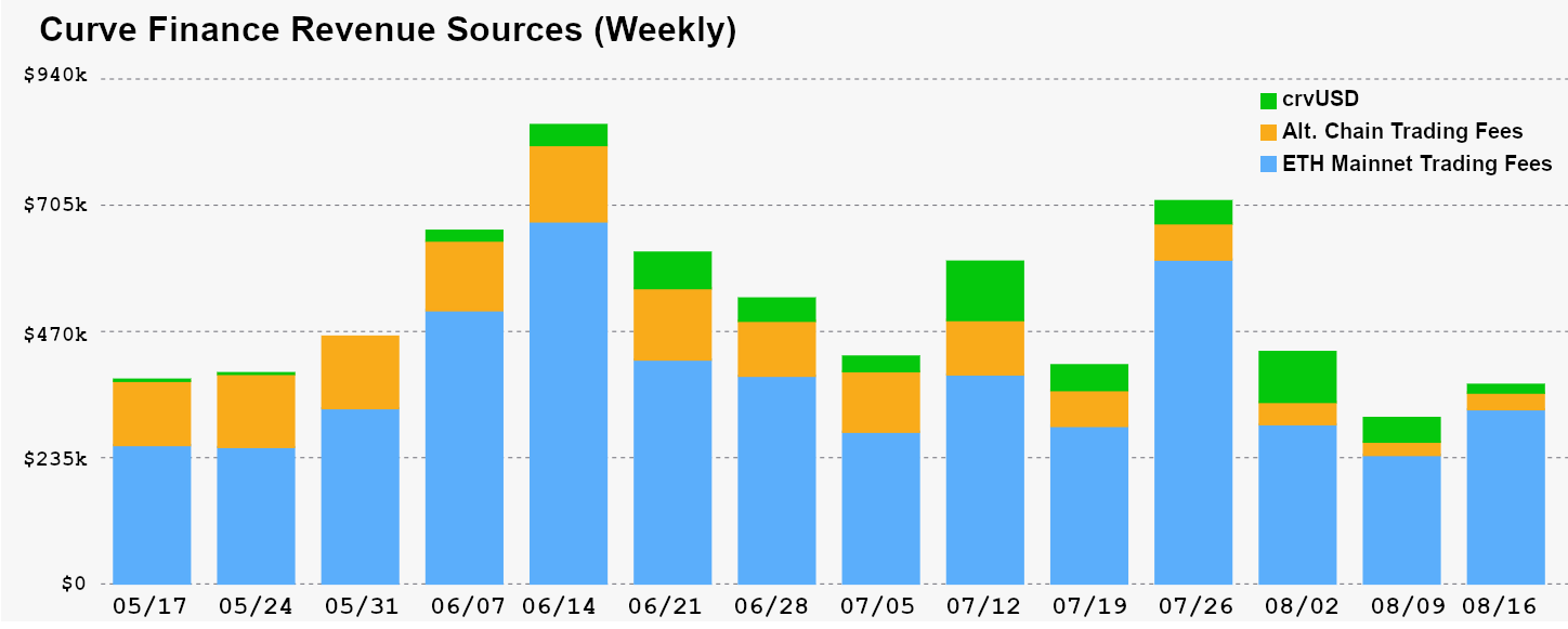 - crvUSD continues to be a reliable source of income for the Curve DAO, with weekly revenue rivalling the combined trading fees from all non-ETH chains. Over the last few weeks, weekly revenues for crvUSD have been in the $15k-$93k range.