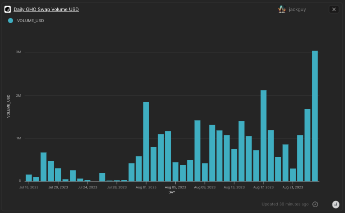 - Since mid-July, GHO token's swap activity has seen a notable rise, escalating from mere hundreds of thousands daily to a current 1-3 million. Interestingly, daily swappers range between 20 and 60, indicating that a limited group handles this substantial volume, highlighting concentrated trading activity.