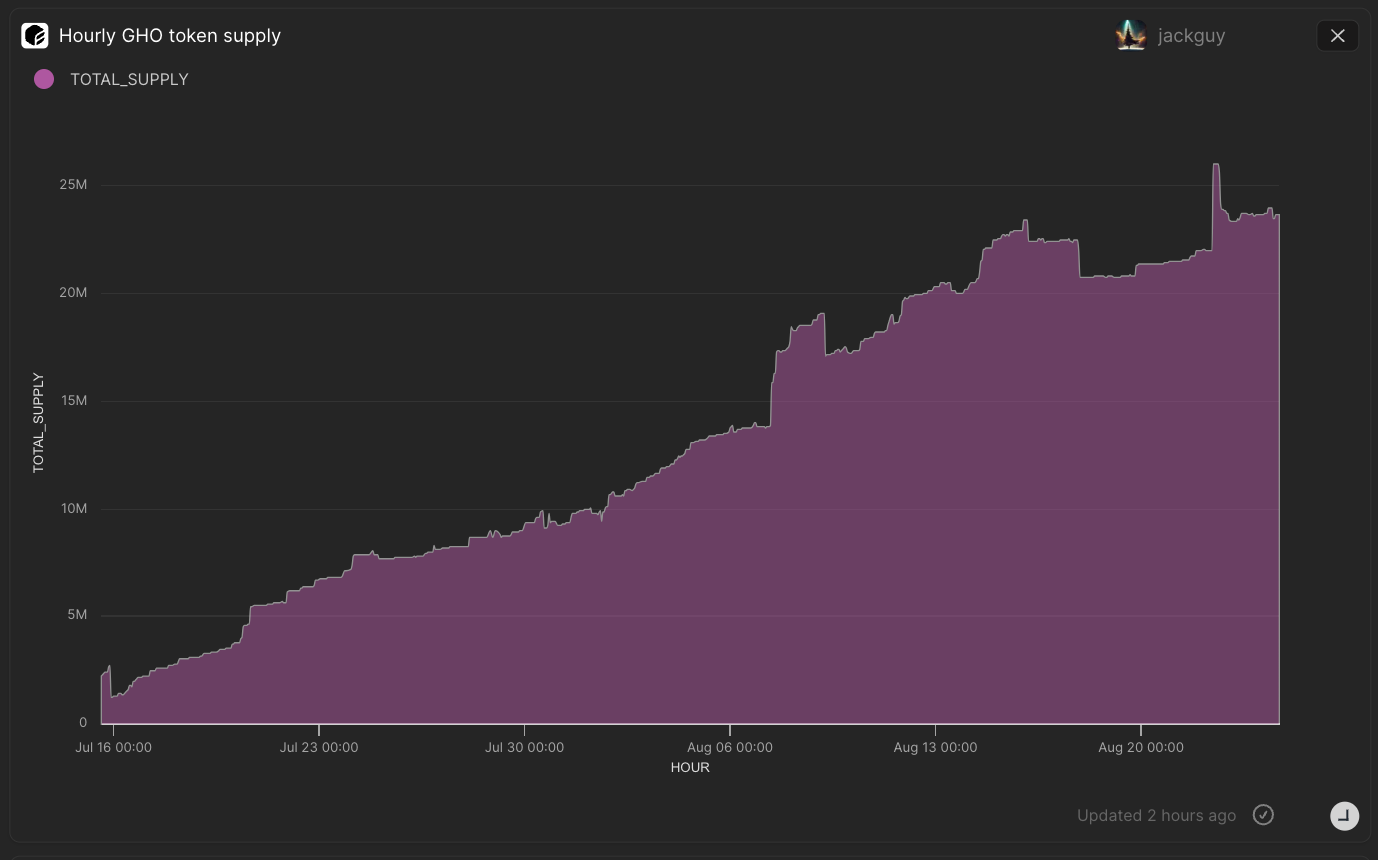- Since July 16th, the GHO stablecoin's—which is pegged to the US dollar—supply has exhibited considerable growth. Starting from under 2 million, it has climbed to over 23 million. In tandem, there has been a Minting of 44 million GHO tokens and a burning of 20 million tokens, activities that any user can undertake. Yet, to contextualize these figures: this 23 million supply is just a small fraction compared to Aave's Total Value Locked (TVL) of $4.62B. This juxtaposition underscores the potential room for growth and the broader landscape in which GHO operates.