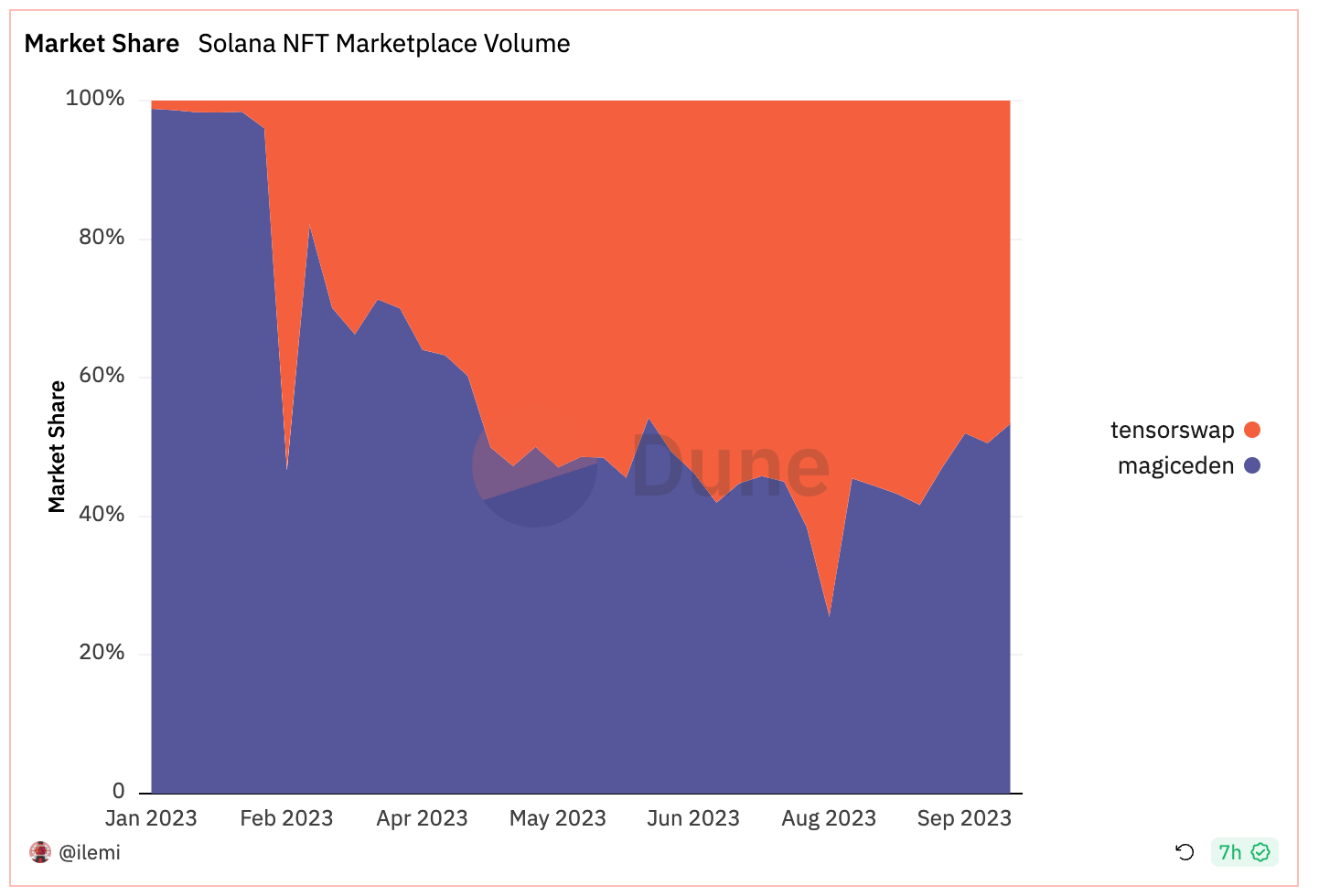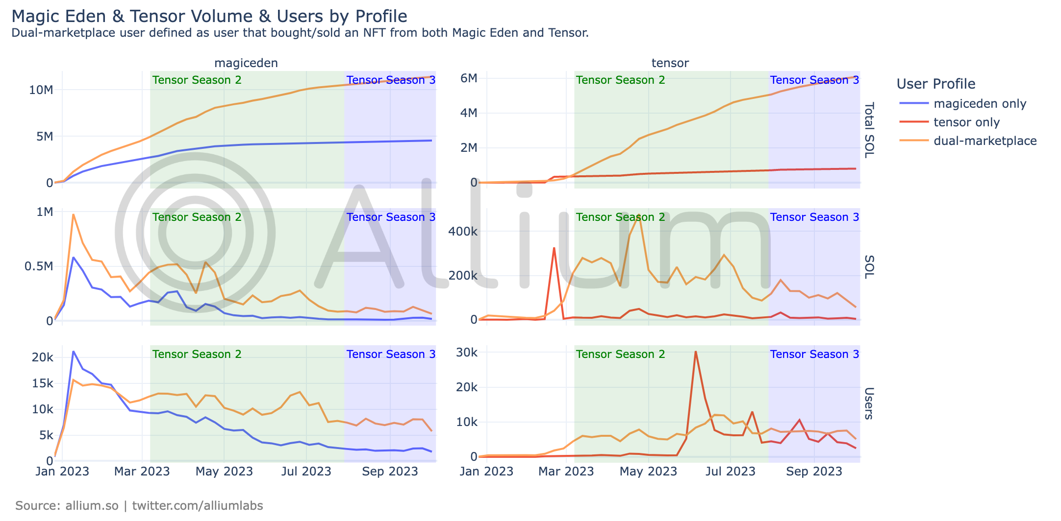 - The battle for NFT market share on Solana resides between two marketplaces, MagicEden and Tensor. Tensor's incentivized airdrops and MagicEden's loyalty program are both strategies that each marketplace has adopted to attract and retain traders. Since 2023, the cumulative SOL volume generated by loyal ME users has been substantially higher than Tensor (40% vs. 13%). Despite having a lower proportion of loyal users compared to Tensor, MagicEden only users were able to generate more volume compared to their competitor.