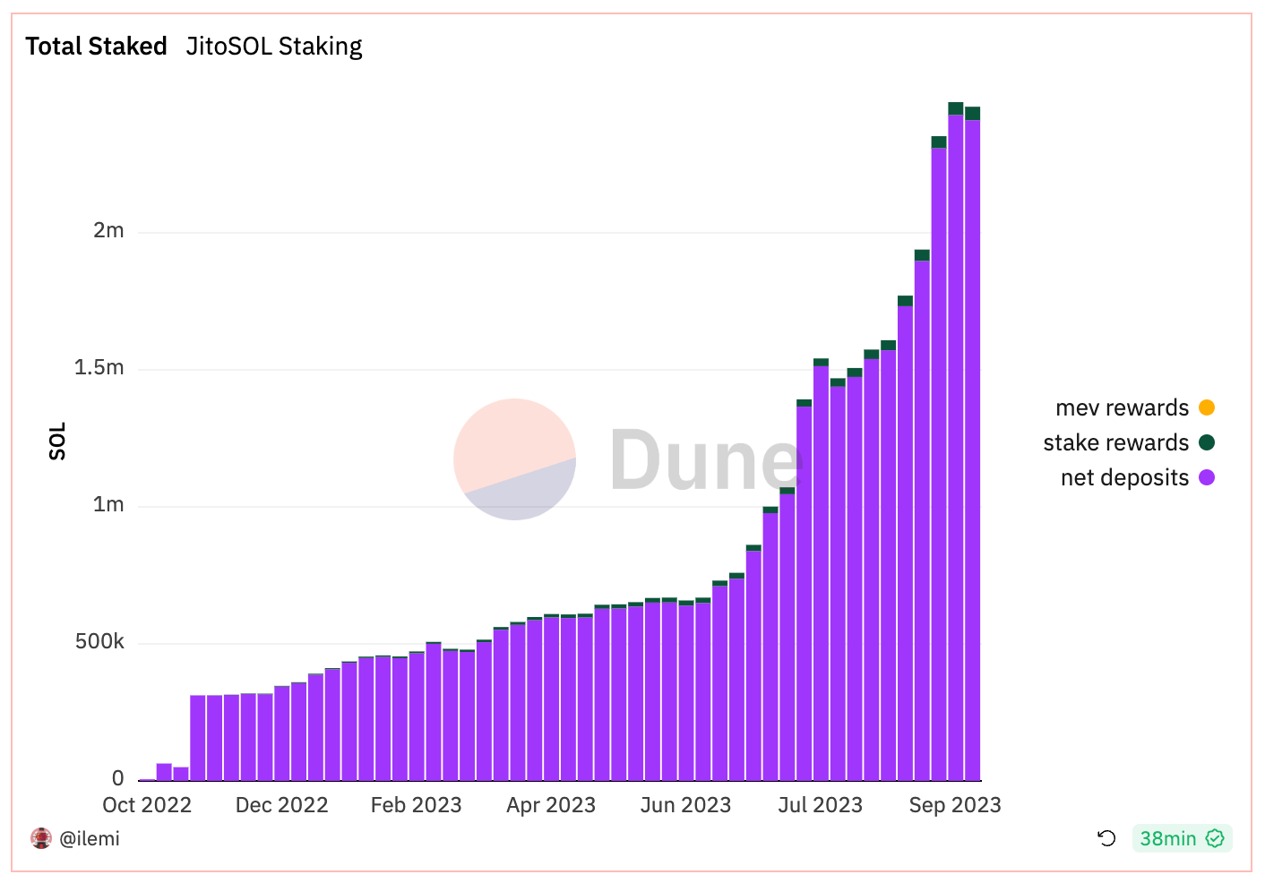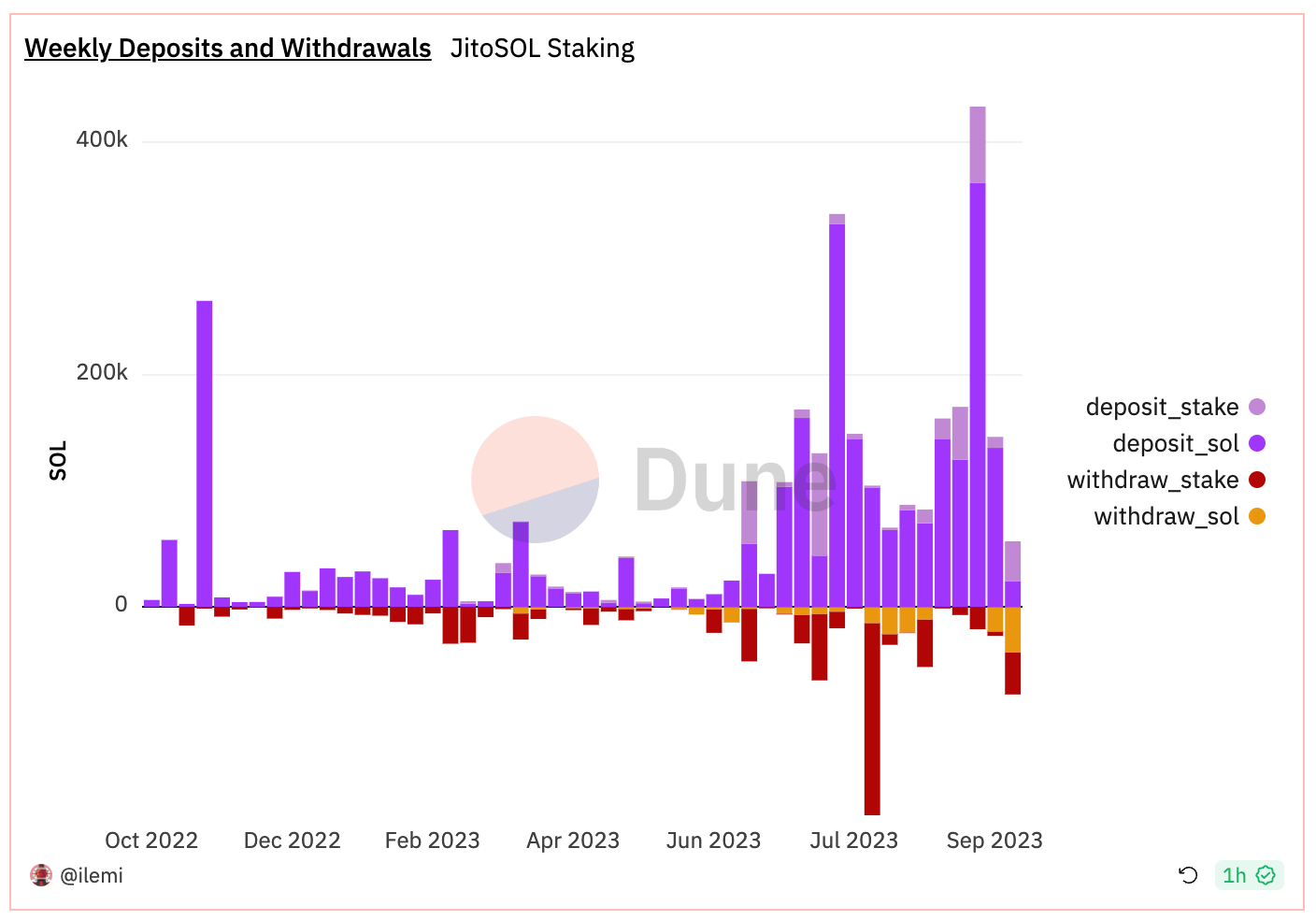 - JitoSOL has attracted over 2.9M SOL deposits, with stake account deposits adding another 382k. Despite these significant inflows, only 194k SOL and 682k from stake accounts have been withdrawn, underscoring JitoSOL's compelling growth and strong user retention over the past year.