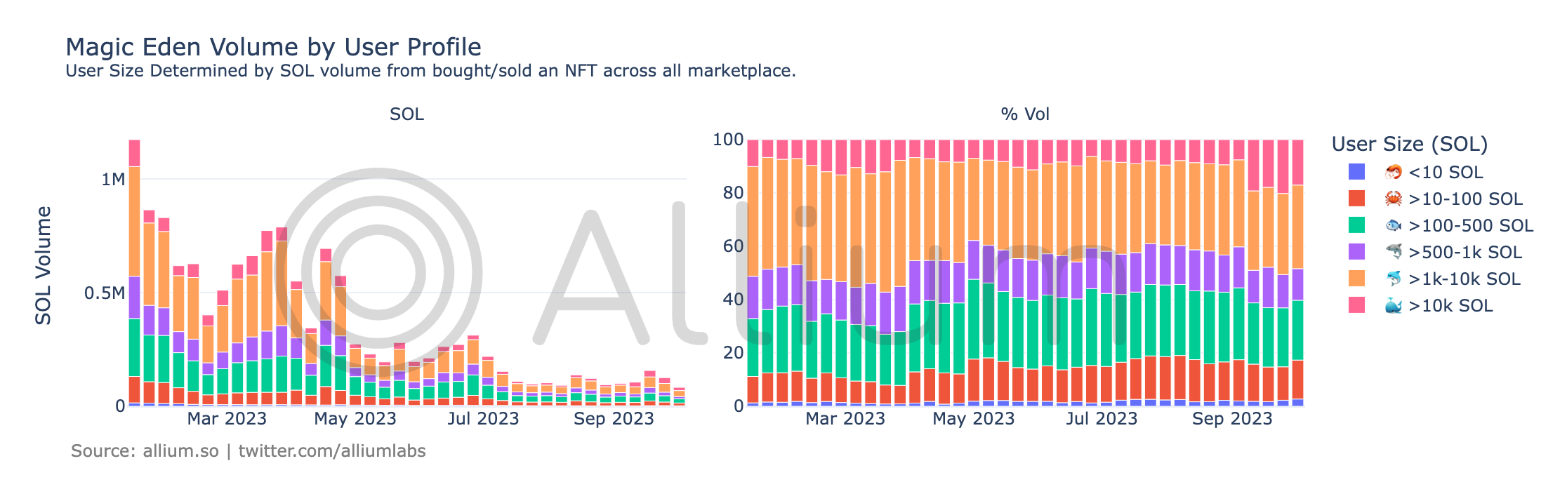 - Retail trades contribute to a substantial portion of Magic Eden volume. The image groups transactions on ME by the trader's all-time NFT transaction volume on Solana. The share of transaction volume on ME generated by whales (users spending >10k SOL on NFTs) has risen from ~10% to 20% from September. Likewise, we see the share of retail volume (users spending <100 SOL on NFTs) has risen from ~10% to 15% for mid-size traders.