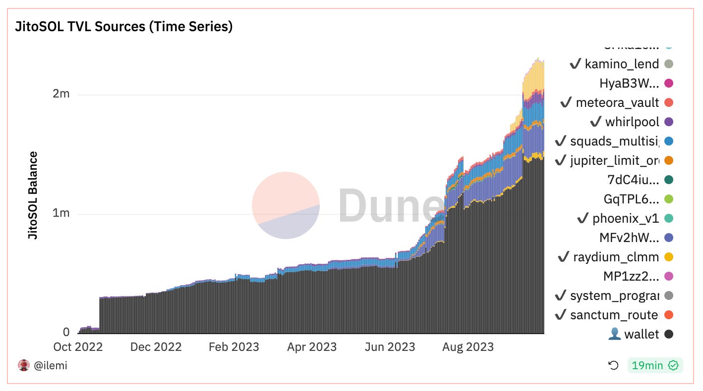 - JitoSOL is Solana’s first liquid staking token to include rewards from revenue associated with MEV extraction. Over the year from Oct 24, 2022, to Oct 4, 2023, JitoSOL experienced hypergrowth with its TVL growing at an average rate of 12.7% weekly. The consistent and exponential increase, peaking at around 2.43M SOL by Sep 25, 2023, underscores JitoSOL's rapidly expanding presence as a dominant liquid staking protocol. As of today Jito is the second largest protocol on Solana by TVL.