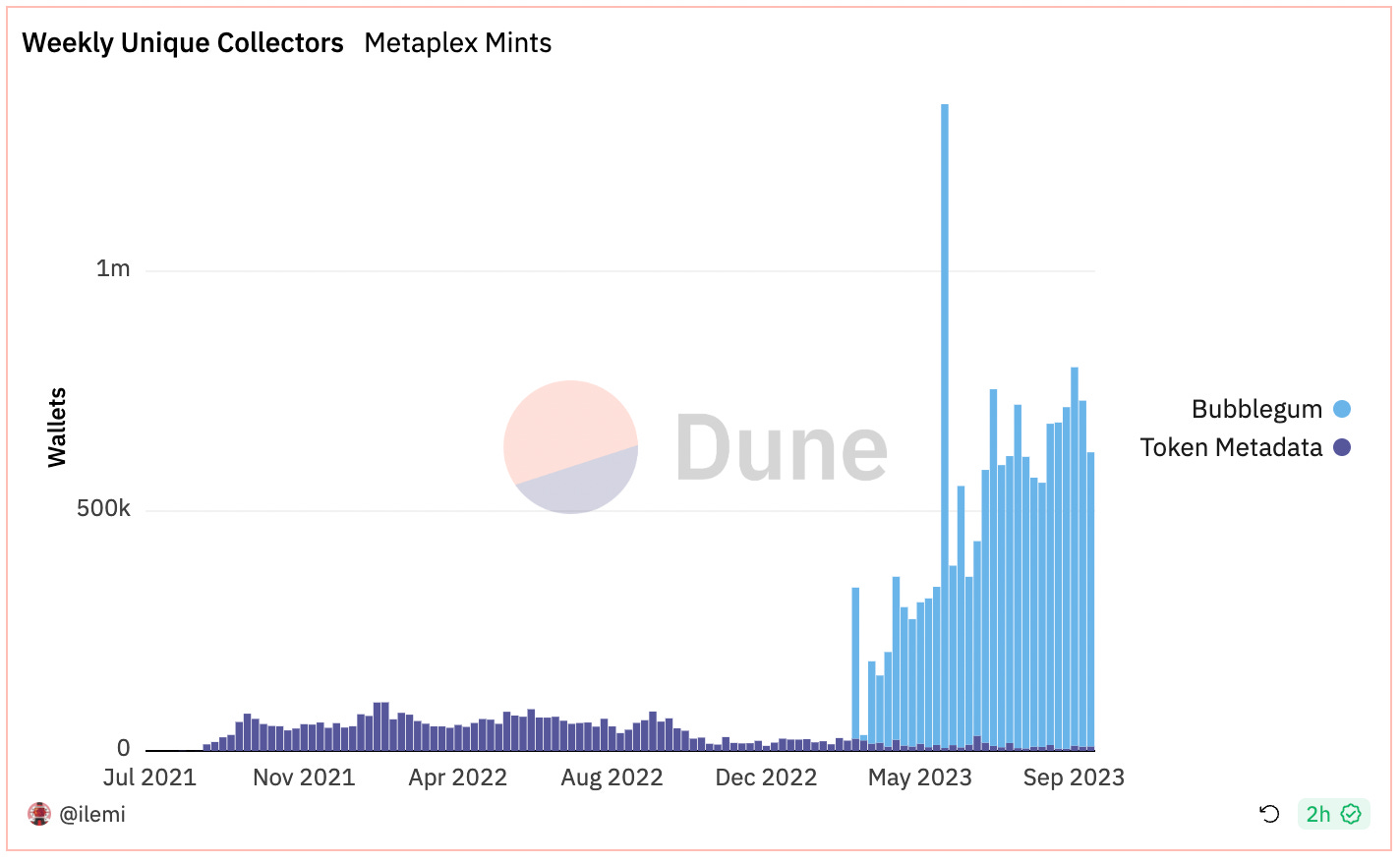 - Similarly, the number of collectors has increased rapidly as well. About 500k wallets are minting every week now - there is debate on how many of these are real wallets, and estimates sit at around 10-15%.