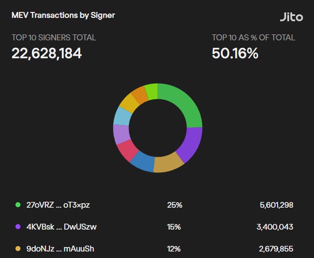 - The top 10 signers accounted for around 50.16% of total successful MEV transactions (around 22.6M transactions signed). The top signer in this case accounted for around 25% of these MEV transactions.
