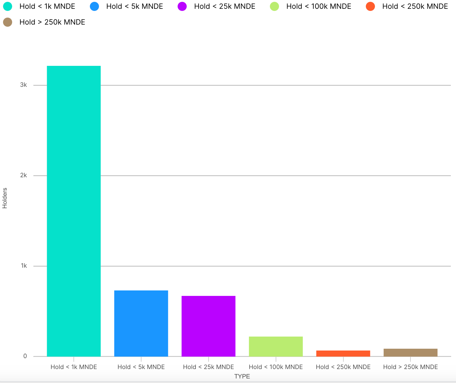 - MNDE is the governance token of Marinade that is a fair-launch with no VC allocation, has been widely distributed across the ecosystem in two years of being on the market. 88 holders have more than 250k MNDE tokens, while there are 3.21k accounts with less than 1,000 tokens.
