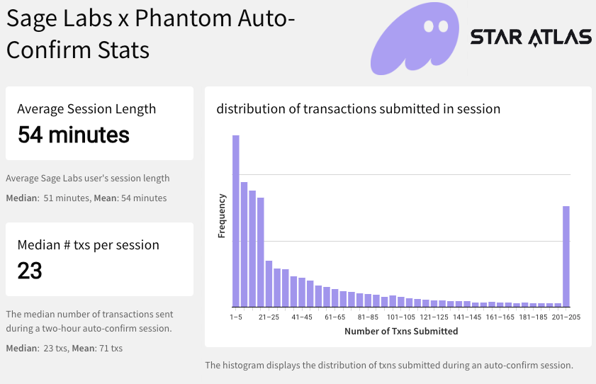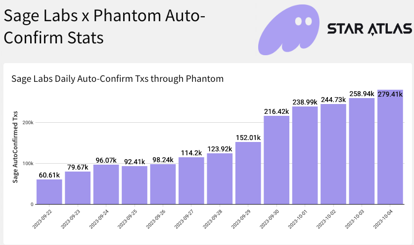 - Sage Labs users have been averaging close to ~1k txs/day, with ~20% of them submitted through Phantom's Auto-Confirm feature, which is Phantom's new beta feature to submit transactions and signed messages without triggering an approval dialog (approval pop-up).
