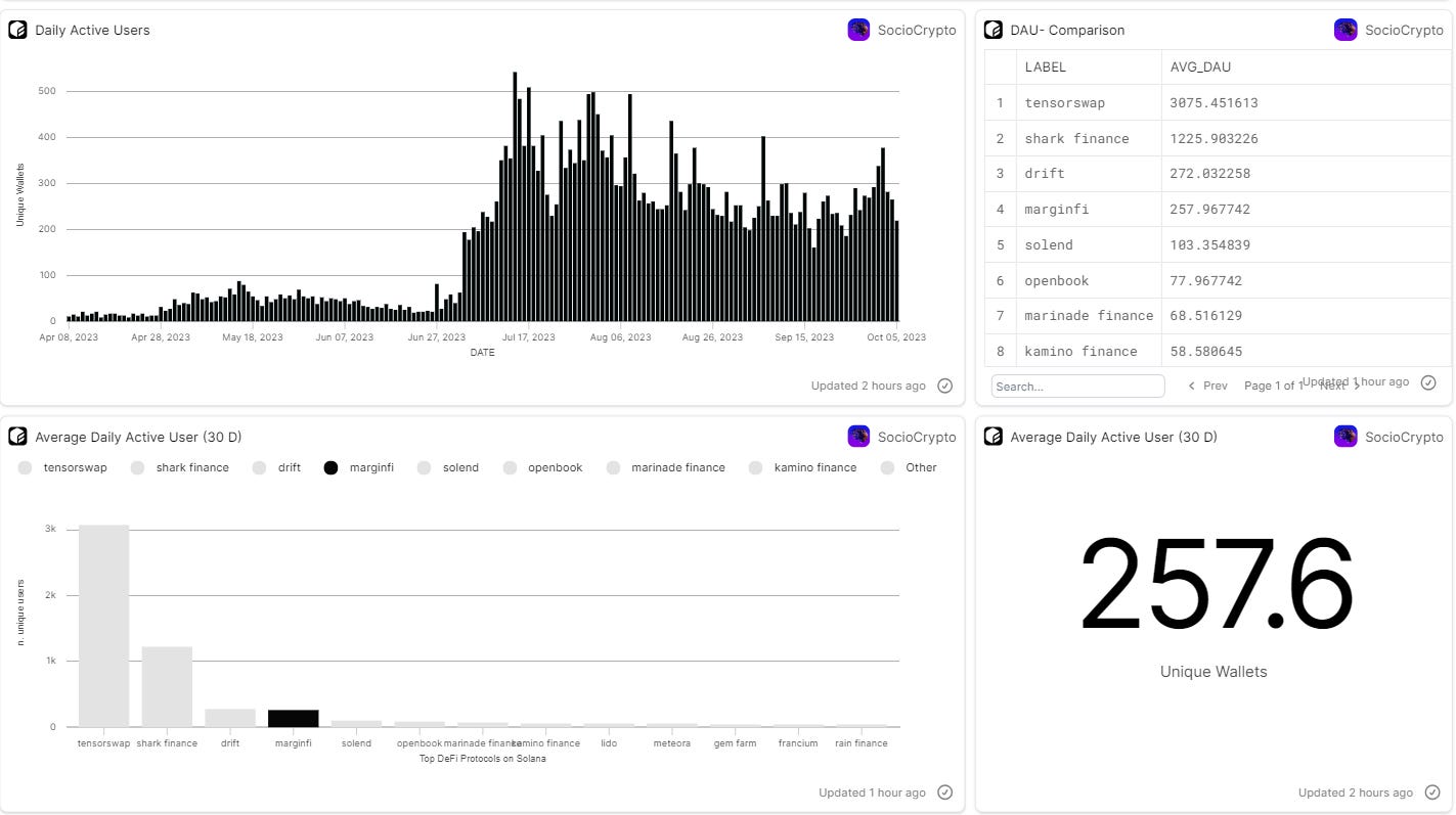 - MarginFi's rapid growth is not limited to TVL. Daily active users (DAU) surged from around 50 to 500, and the platform has maintained user engagement, with an average of 257 DAUs in the past month, ranking MarginFi fourth among DeFi protocols on Solana.