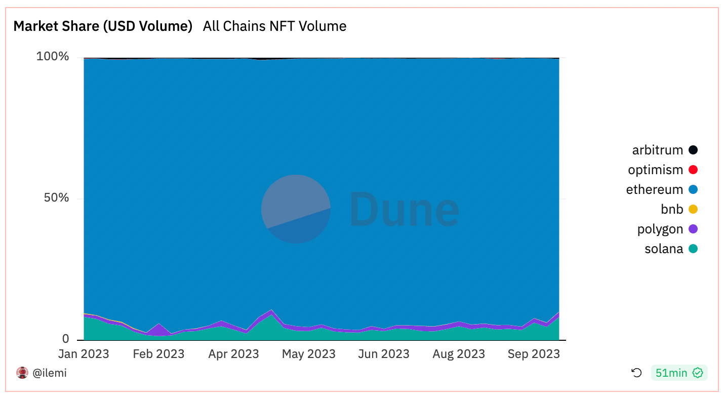 - Putting the Solana marketplace into perspective, if we place it next to the Ethereum ecosystem then Solana now makes up 8% of weekly NFT trading volume. Solana did $4M in volume last week (9/25), Ethereum did $77M with Polygon next at $1.2M.