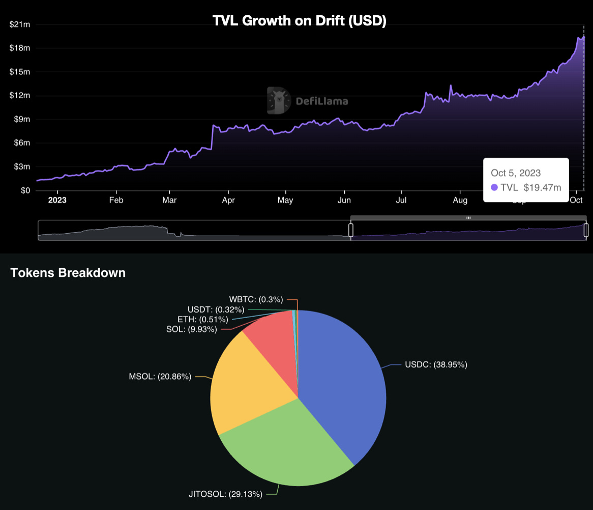 - Total value locked in Drift has surged past it’s all-time-high set in 2022 with over $20M USDC equivalent of TVL. Over 45% of TVL comes from using LSTs (mSOL, jitoSOL) as collateral to trade perps, allowing users to earn yield while trading.