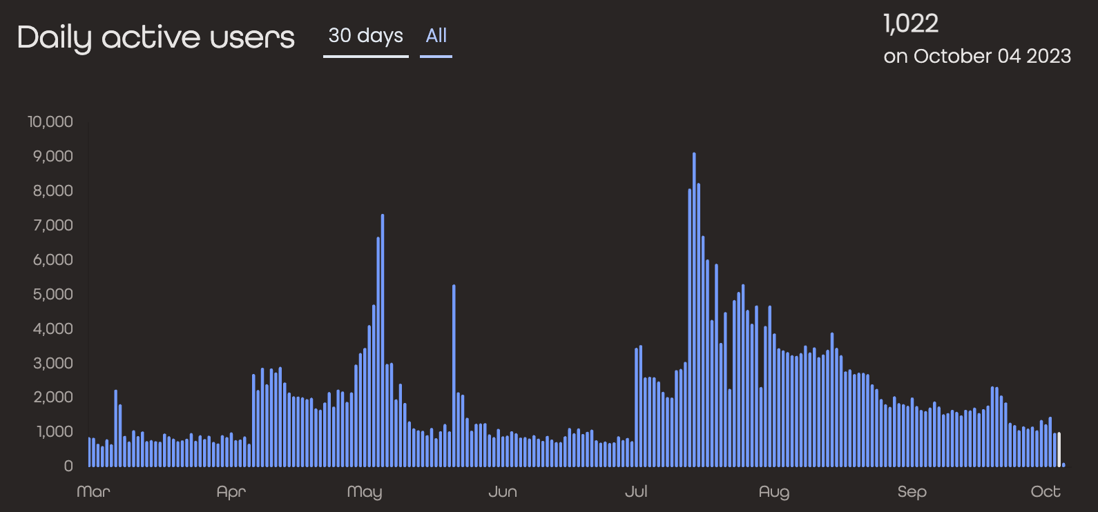 - Since August Daily Active Users have been averaging between 1,000 and 2,000, peaking at over 9,000 on July 15th. Note: this data is only inclusive of on-chain actions (creating a subscription or claiming rewards). Existing users accessing content are not included.