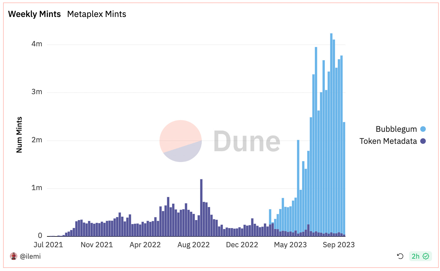 - NFT minting volume has taken off due to "compressed NFTs" which allow you to mint 1 million NFTs for approximately $110. This has led to close to 60 million cNFTs minted since March 2023. A lot of this is driven by the Helium network, but also has become more used in communities with collections like Tensorians.