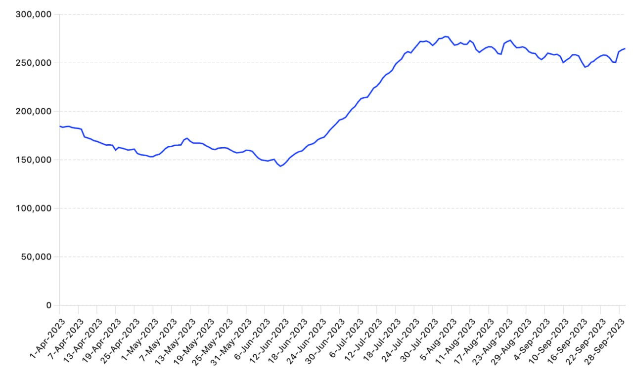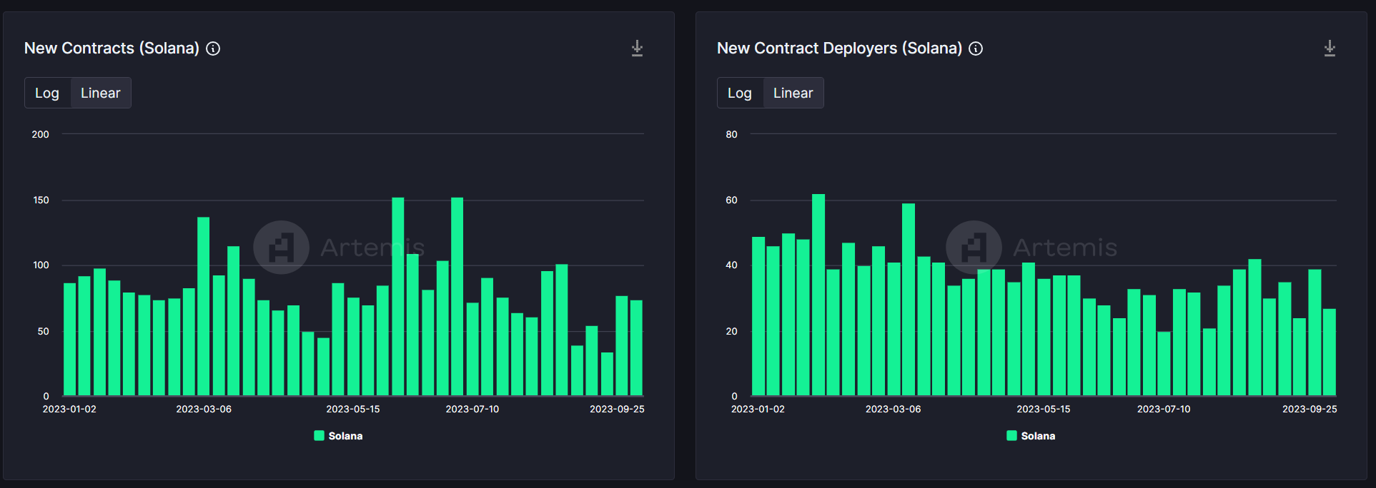 - Finally, similar to the other major smart contract platforms in crypto, Developer Activity on Solana has declined over 2023, with ~160 core developers being active in the past week vs. ~540 at the beginning of the year. While New Contracts Deployed and New Contract Deployers have also come down, the remaining developers have remained largely resilient during the crypto bear market with ~60 new contracts deployed per week in September 2023.