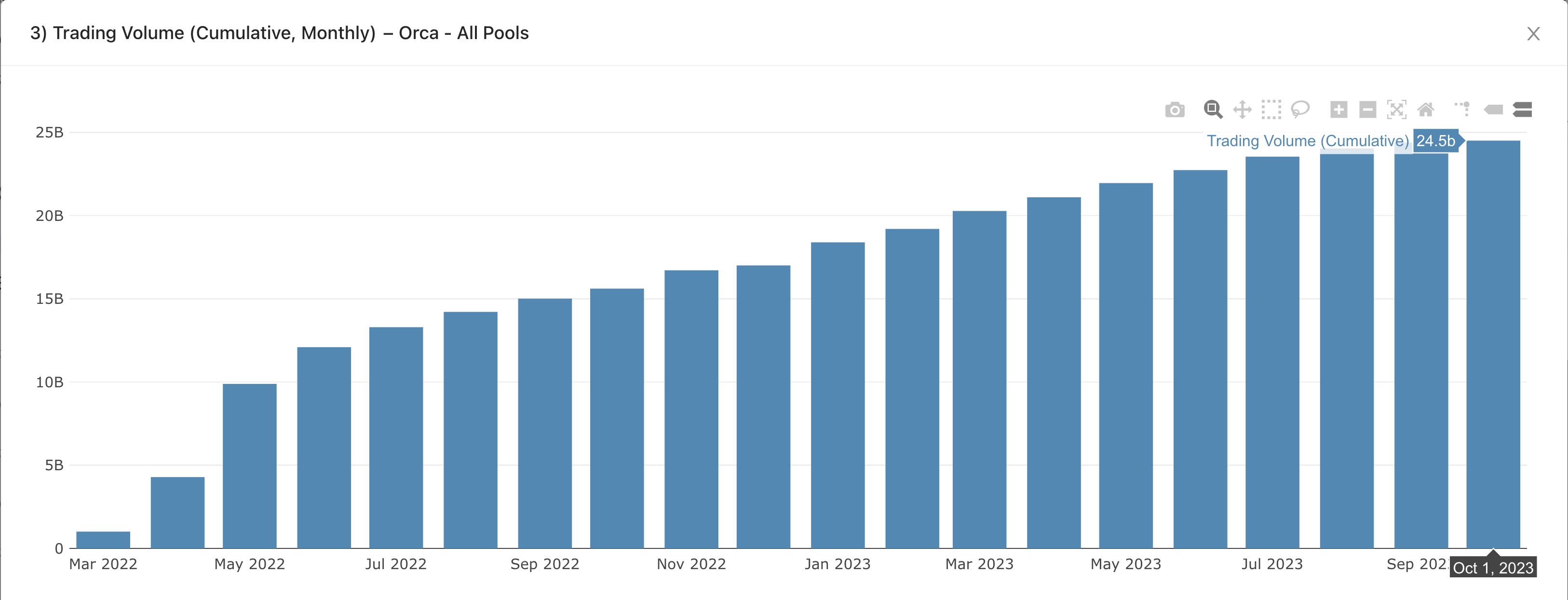 - Since inception, more than $24B of trading activity has gone through Orca’s concentrated liquidity pools. This volume is diversified across major pairs like SOL/USDC, pegged pairs like liquid staking tokens, and ecosystem tokens from projects across Solana, giving LPs and traders alike a wide range of options.