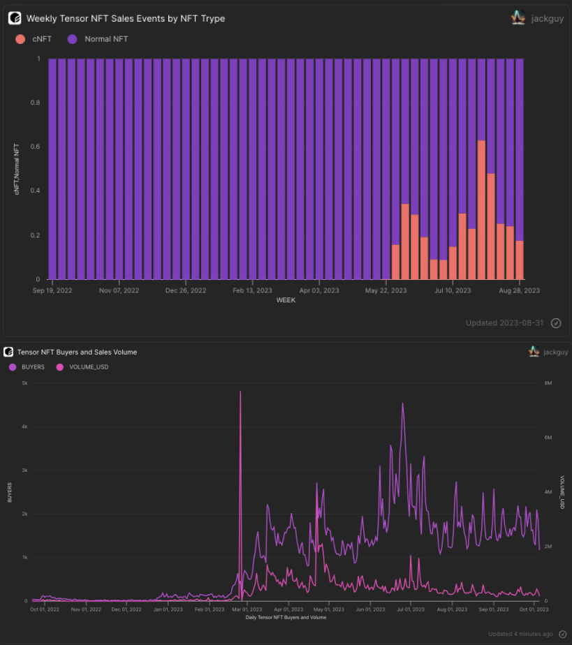- In May 2023, Tensor HQ introduced sales of compressed NFTs, commonly referred to as cNFTs. What is remarkable about this development is the traction these cNFTs have gained in a short span of time. cNFTs have accounted for an astounding 20-65% of total sales on the Tensor platform.