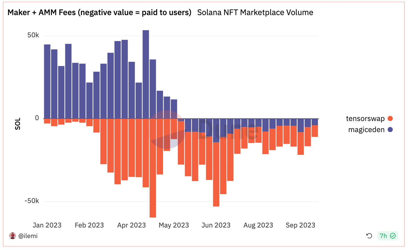 - On Ethereum, there has been a lot of competition through cutting royalties. Solana marketplaces enforce royalties and compete on maker/taker fees instead. Magic Eden started the year with 0.4% maker and 1.4% taker fees, but due to Tensorswap AMM maker fees, they started giving makers a 0.4% rebate.